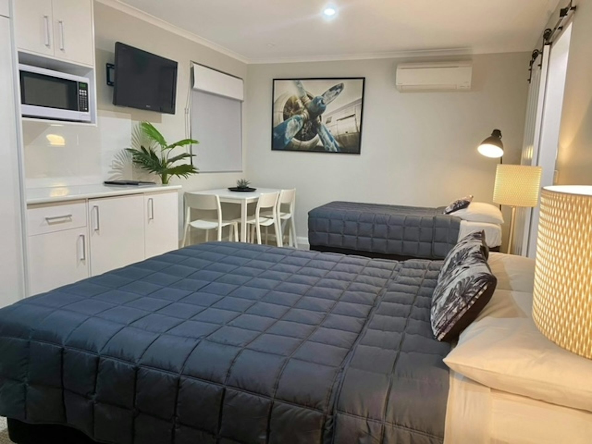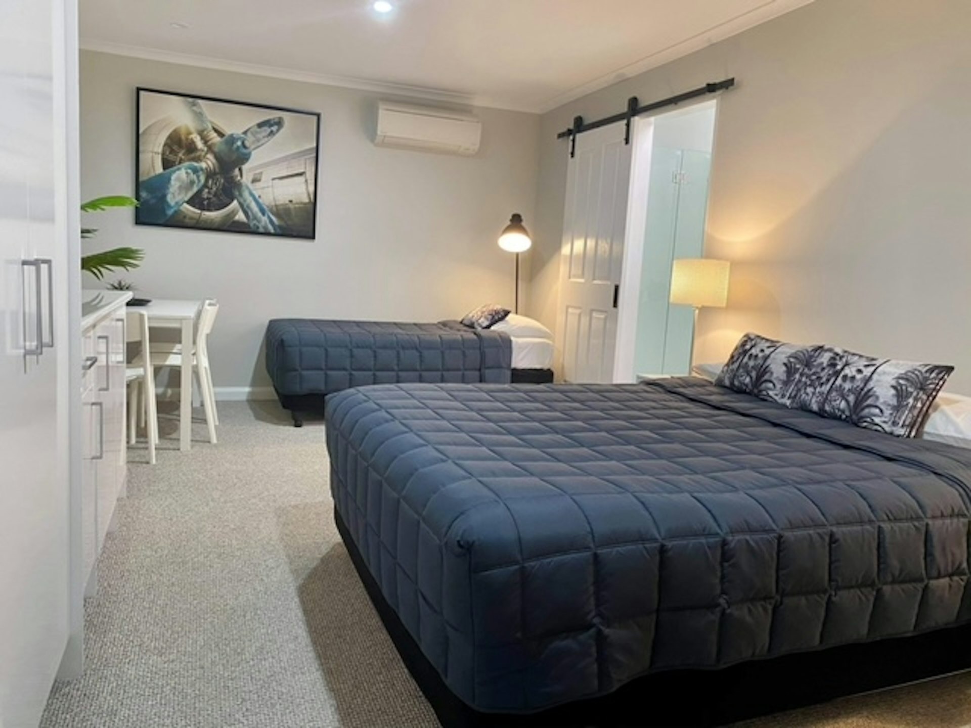 Standard Inclusions: Lounge, table, bar fridge, microwave, tea/coffee-making facilities, ensuite, ironing facilities, TV, Wireless Broadband, silent water heating, and air-conditioner.